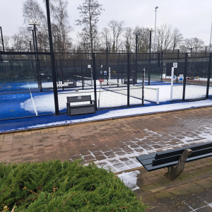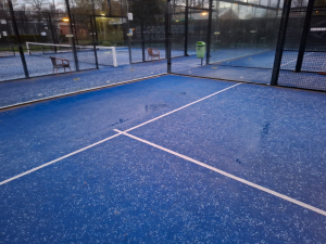 Een paar plassen op de padelbaan, dus niet spelen en niet vegen